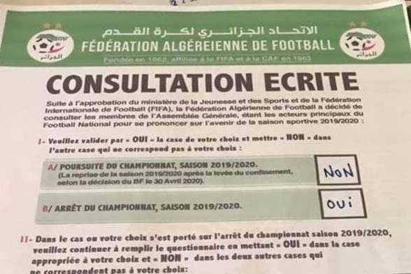 96 membres sur l’ensemble des 112 (85.7%) composant l’assemblée générale de la Fédération algérienne de football (FAF), se sont exprimés, via une consultation écrite, pour se prononcer sur l’avenir de l’exercice 2019-2020, suspendu depuis le 16 mars en raison de la pandémie de Covid-19, a annoncé lundi soir l’instance fédérale sur son site officiel.16 membres des membres de l’AG (14.3%), ne se sont pas exprimés, ajoute la même source, soulignant que 3 membres ont transmis une fiche non renseignée. Sur l’ensemble des 32 clubs composant les deux Ligues professionnelles, seules la JS Kabylie et l’ES Sétif ne se sont pas exprimées, à annoncé une source autorisée.« Cette opération s’est déroulée dans de bonnes conditions et s’est clôturée à la date prévue. La FAF retient avec satisfaction que la sagesse, le sens des responsabilités et la préservation des intérêts de tout le football algérien ont prévalu », a noté l’instance fédérale dans un communiqué. Suite au refus du MJS d’autoriser la FAF à organiser une assemblée générale extraordinaire (AGEx) pour se prononcer sur l’avenir de l’exercice 2019-2020, l’instance fédérale a fini par recourir à une consultation écrite de ses membres. Le formulaire en question propose d’abord deux choix A et B : poursuite ou arrêt de la saison. Dans le cas où la seconde option est cochée, chaque membre aura à choisir entre B1, B2 et B3 qui équivalent à : saison blanche (résultats de la saison 2019-2020 annulés), désignation des lauréats, clubs qui accèdent et ceux qui rétrogradent et enfin désignation des lauréats, des clubs qui accèdent mais sans relégation. Le Bureau fédéral, se réunira en session extraordinaire mercredi prochain, pour examiner les résultats de cette consultation “avant de se prononcer sur la suite à donner à ce dossier”, conclut la FAF.